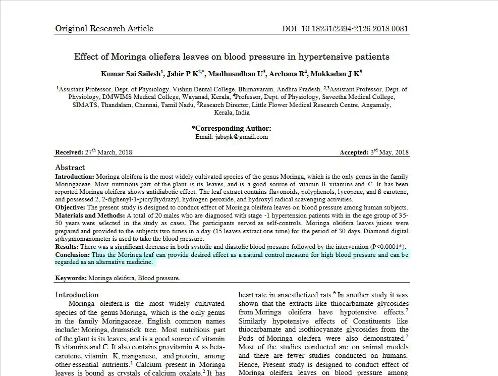 “Kajian klinikal ini membuktikan bahawa daun Moringa boleh menjadi alternatif semulajadi yang berkesan untuk mengawal tekanan darah tinggi”